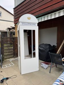 Nach dem Gerüst folgten zugeschnittene Holzplatten, Fensteröffnungen und Gitterelemente, die die typische Telefonzellen-Optik erzeugen.